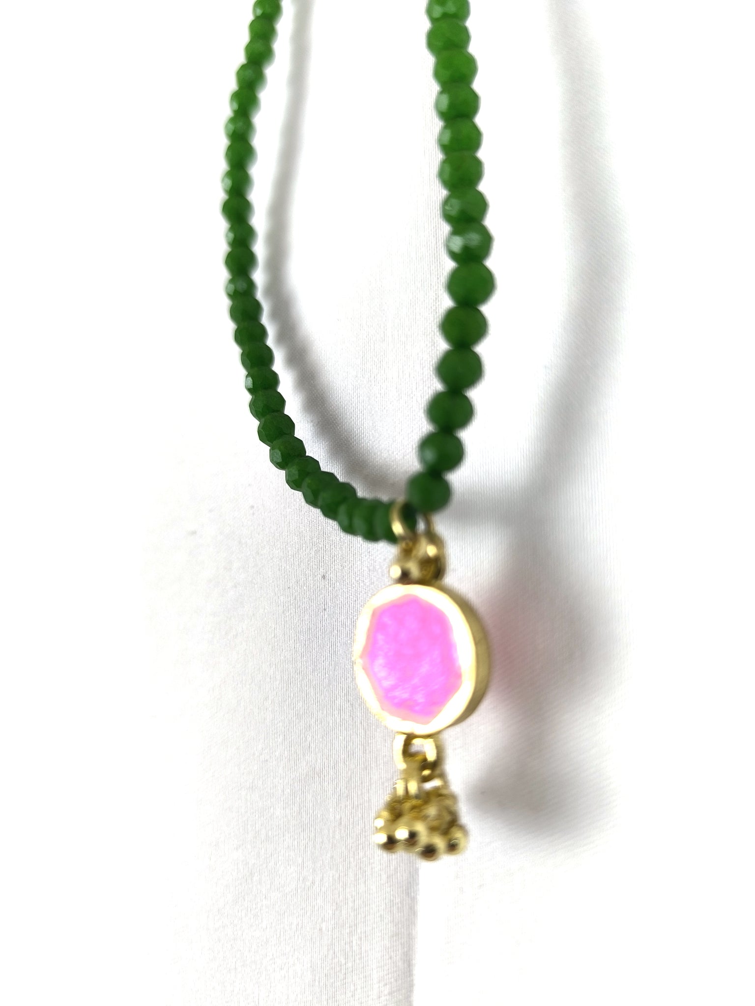 Kette von Soul Kathrine mit grünen Perlen und einem goldfarbenen Anhänger mit pinkem Stein und violettem Tassle